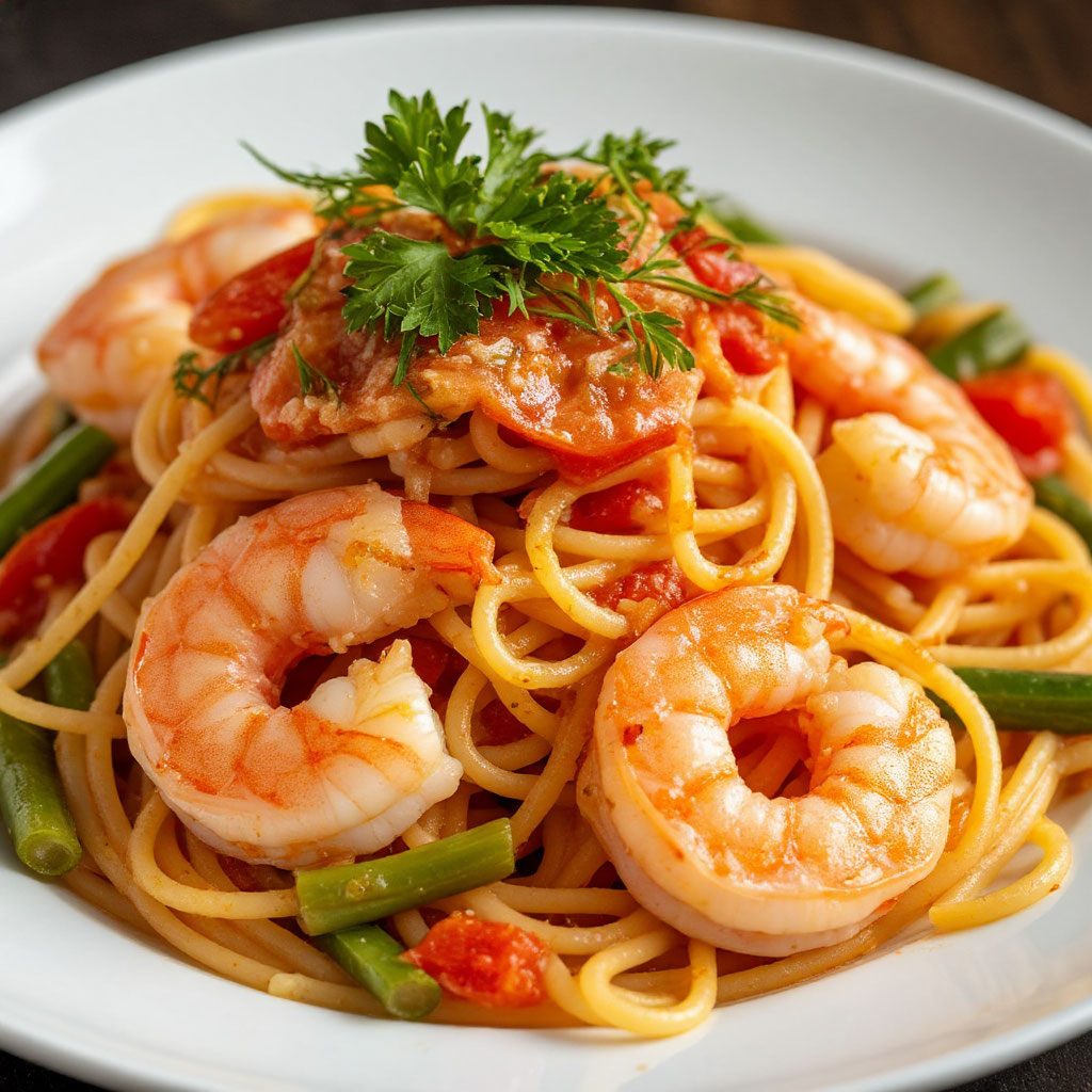 - Креветки с пастой: масло + оливковое масло, свежие травы, чеснок, креветки, обжарить до готовности; подавать с цельнозерновой пастой и свежими помидорами.