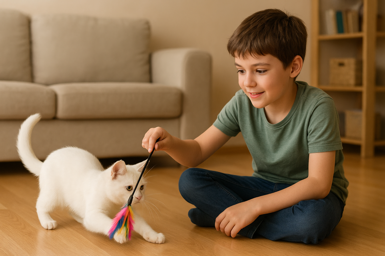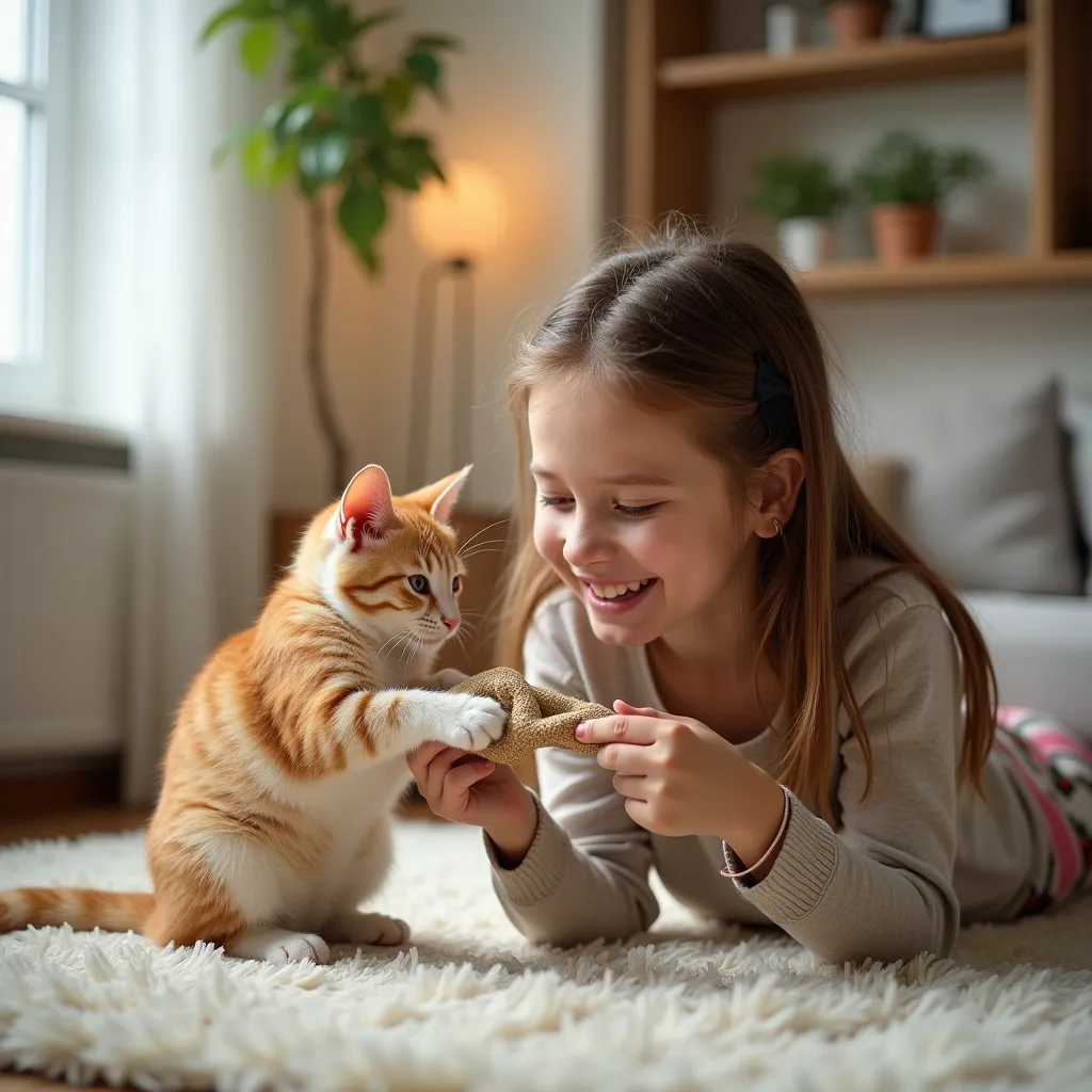 Игрушки, в которых вы участвуете вместе с кошкой, особенно важны. Такие занятия укрепляют связь между питомцем и хозяином, помогают выработать доверие и снижают тревожность у животного. Классические примеры — дразнилки, «удочки» с перьями, шуршащими ленточками или колокольчиками. Кошка преследует цель, делает стремительные прыжки и ловкие рывки, а вы становитесь частью этой игры.