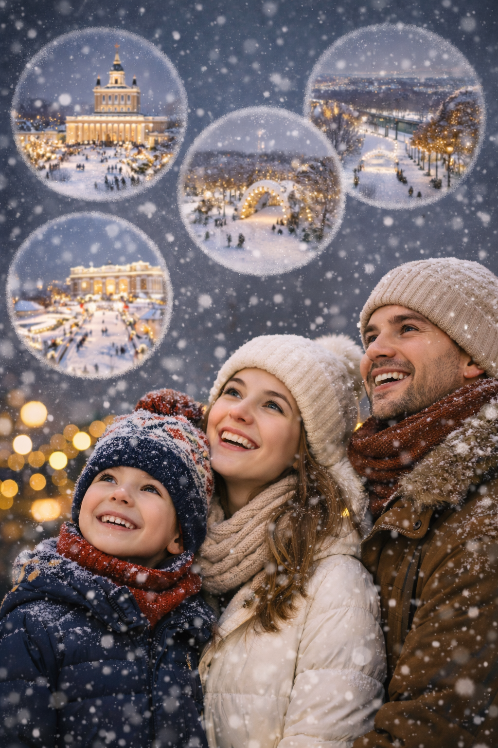 ВДНХ в холодный сезон — это сочетание масштабных площадей и архитектурных павильонов. Снег очерчивает величественные строения, а катки и сезонные ярмарки создают ощущение мегаполиса внутри большого парка.