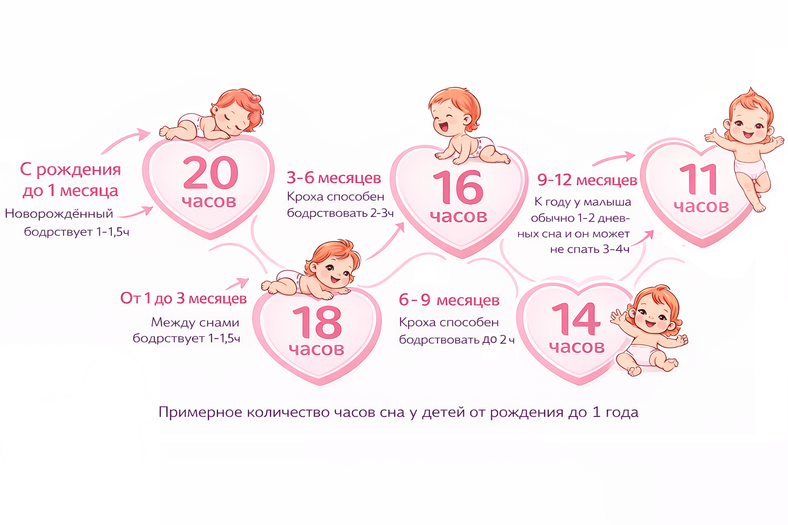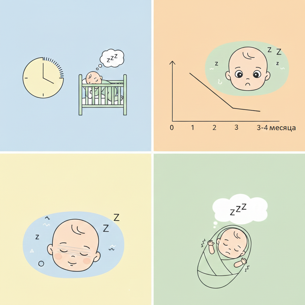 Малыш спит короткими эпизодами по 20–60 минут, без различия дня и ночи, с частыми пробуждениями для кормления.