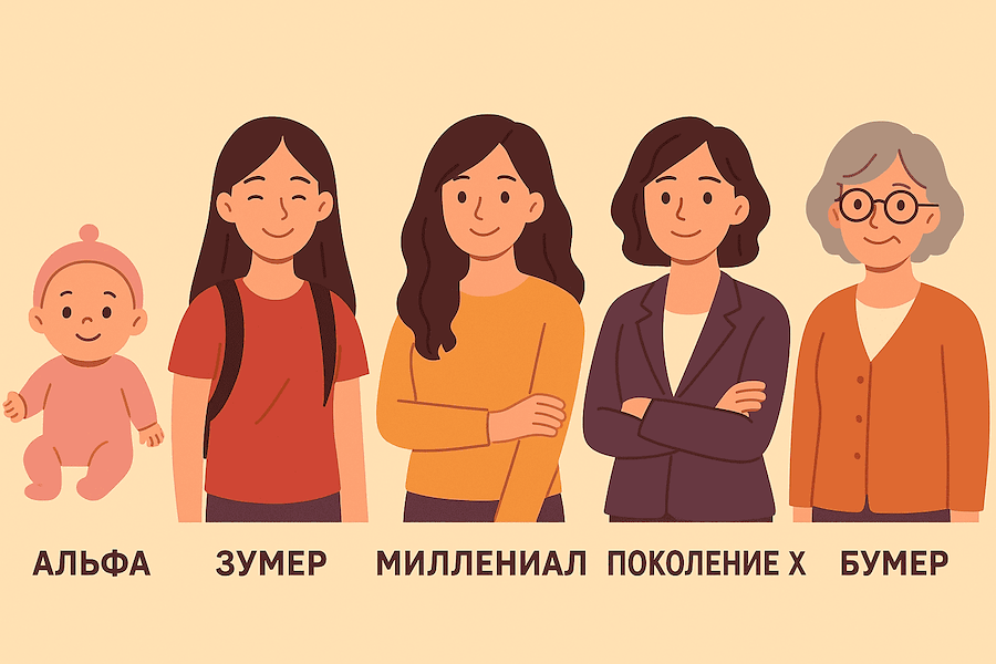 - Поколение Z (1996–2010) — «цифровые аборигены», живущие в соцсетях и мессенджерах.