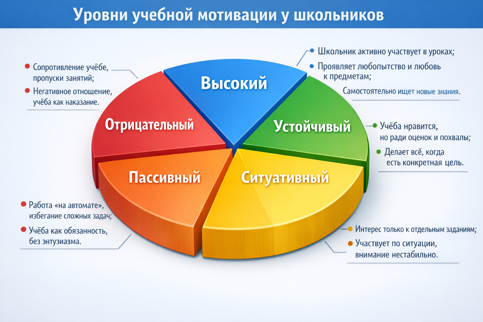 5. Отрицательный. Проявляется активное сопротивление учёбе: ученик пропускает занятия, отказывается выполнять задания, испытывает негативные эмоции и воспринимает обучение как наказание или скучную обязаловку.