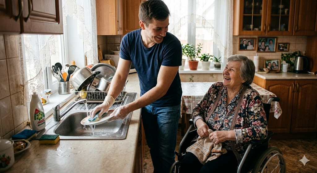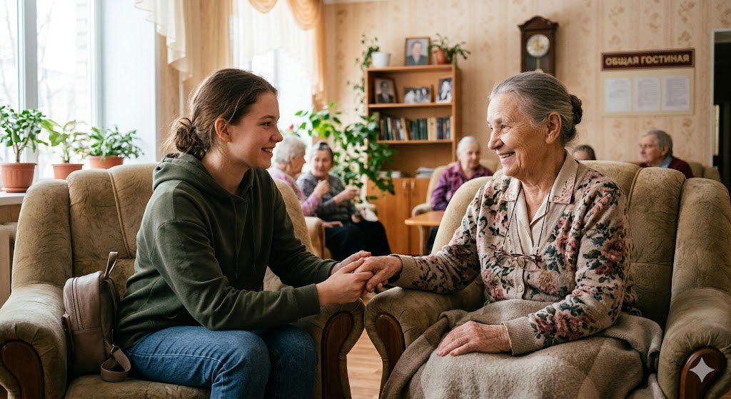- помогает в бытовом уходе и поддерживает спокойное общение.